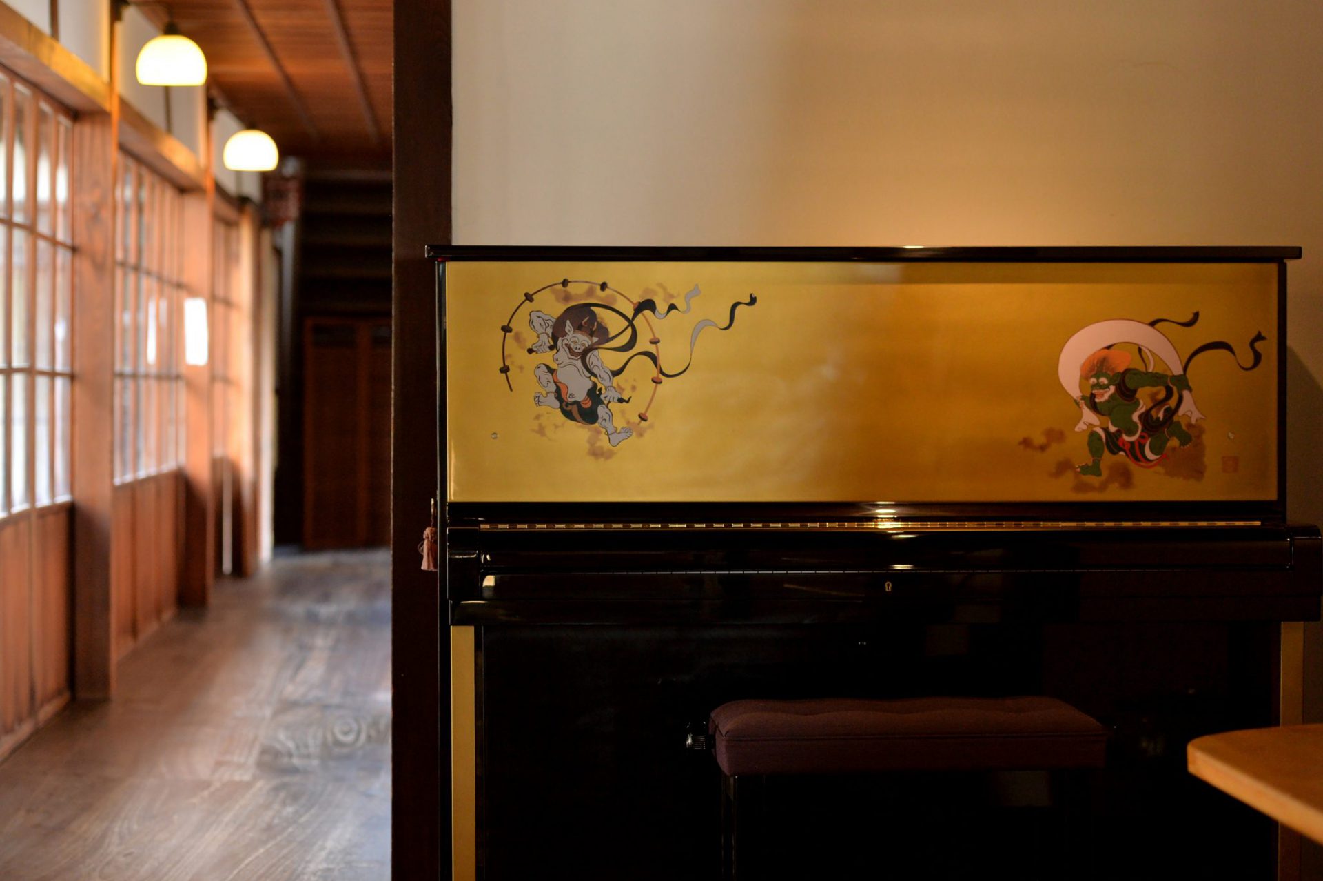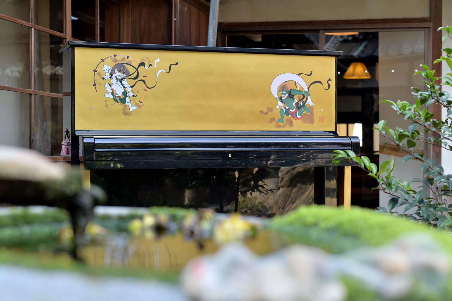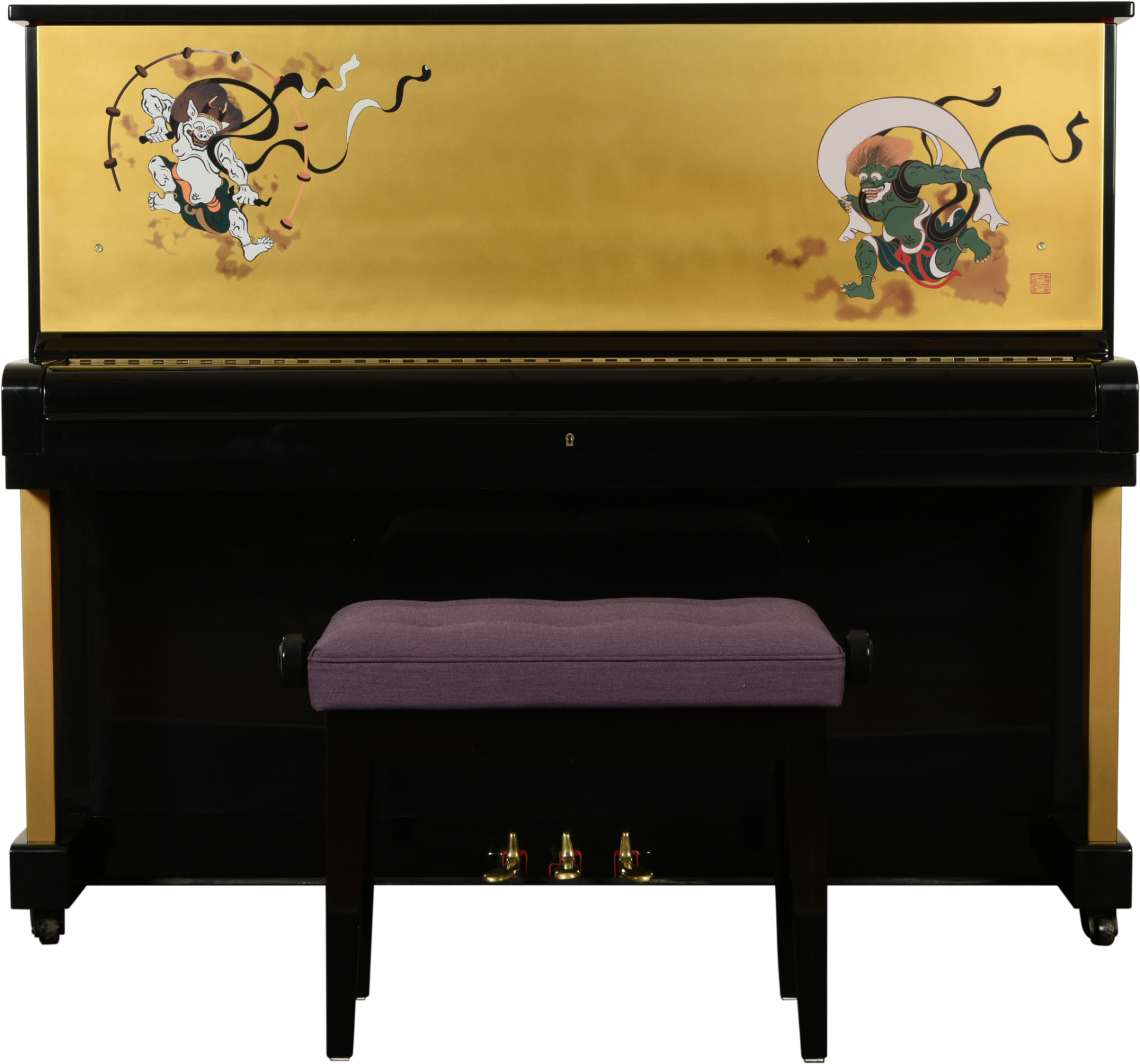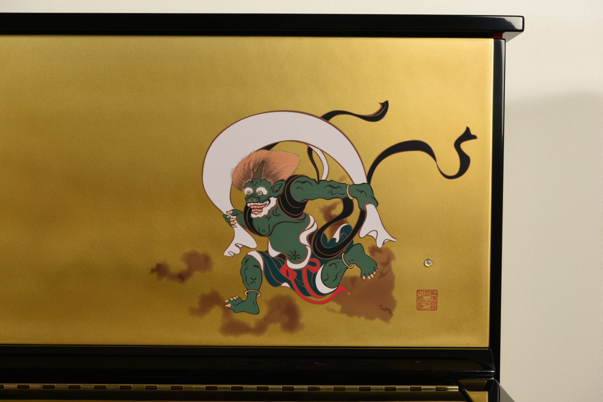 風袋から風を吹き出し、下界に風雨をもたらす風神と、太鼓を叩いて雷鳴と稲妻をおこす雷神の活動の姿を描写する風神雷神図をピアノに表現しました。